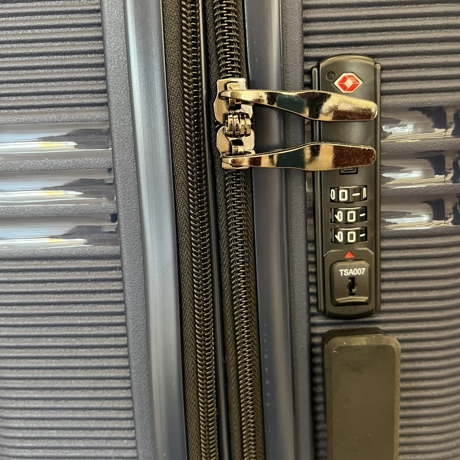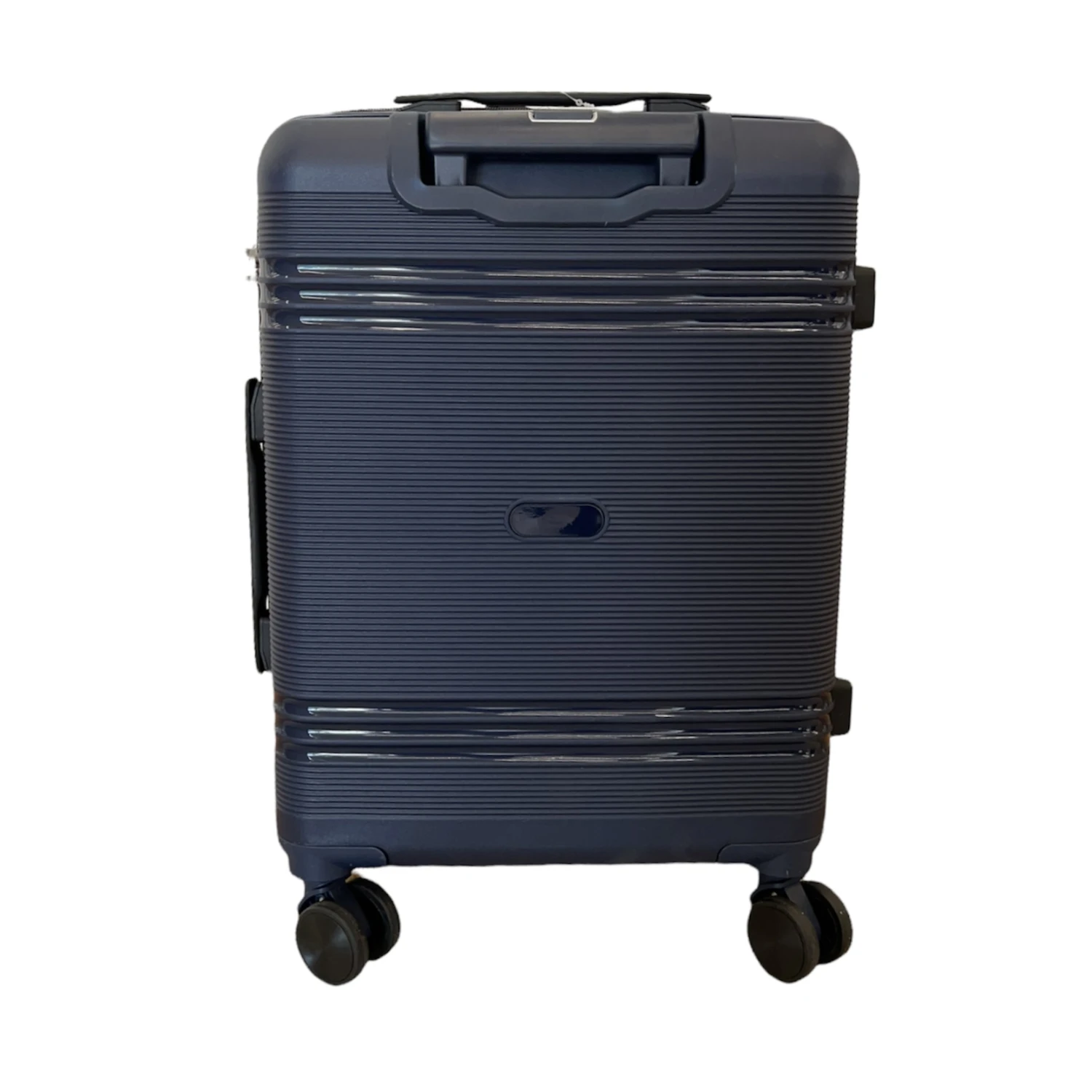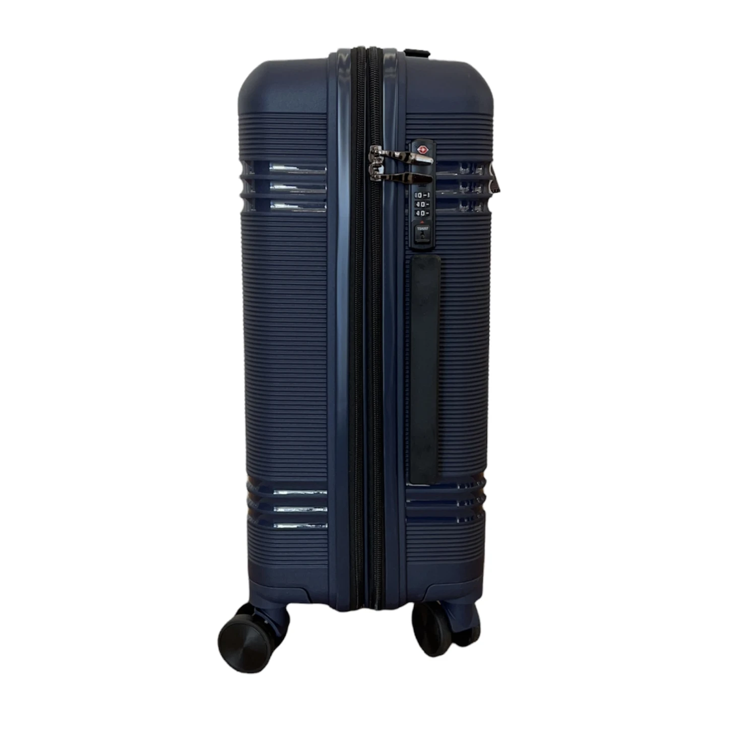 Maleta Bienoti de diseño bilbaino, tamaño mediano , con medidas 66 x 43 x 26 cm , con una doble cremallera que se puede expandir hasta 30 cm. Capacidad de 67 litros, expandible a 77,4 ltrs. Fabricada en resistente polipropileno. Dispone de cerradura con combinacion de 3 digitos y cerradura TSA, para viajar seguro a los aeropuertos de EEUU. Color Azul Marino