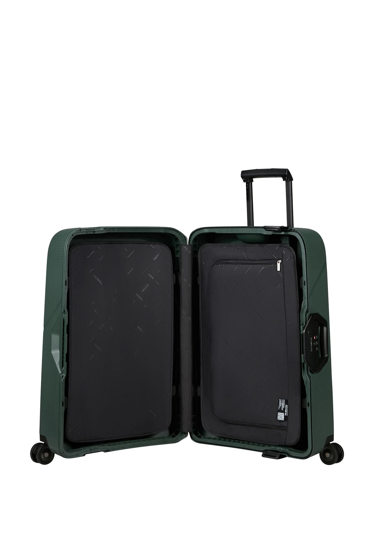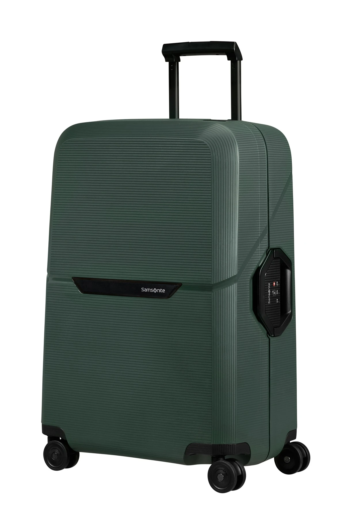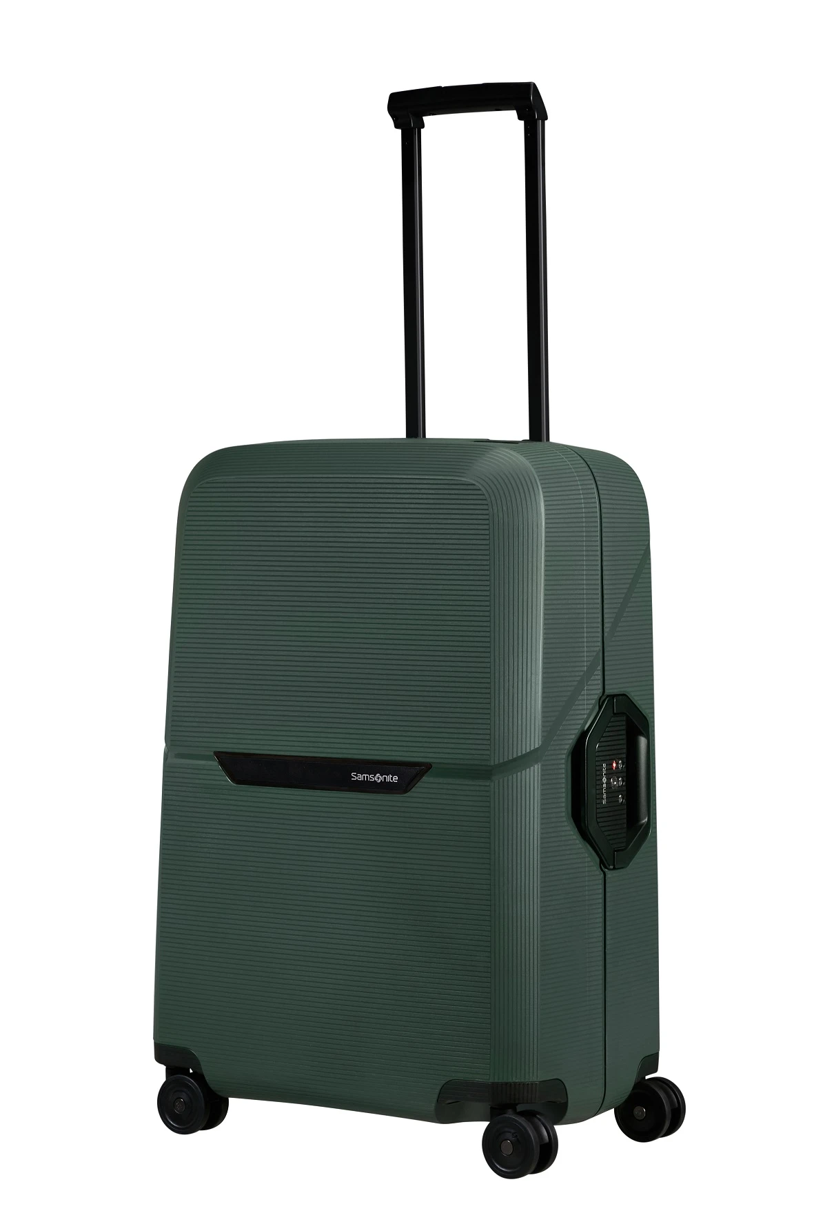 Maleta Spinner de la marca Samsonite Modelo Magnum Eco de color verde y tamaño mediano La maleta de viaje está fabricada en Polipropileno, siendo muy resistente y ultraligera, se apoya en 4 ruedas grandes, contiene asa telescópica y cerradura de combinación triple con sistema TSA. El spinner es ecológico ya que ha sido fabricado con residuos plásticos reciclados.