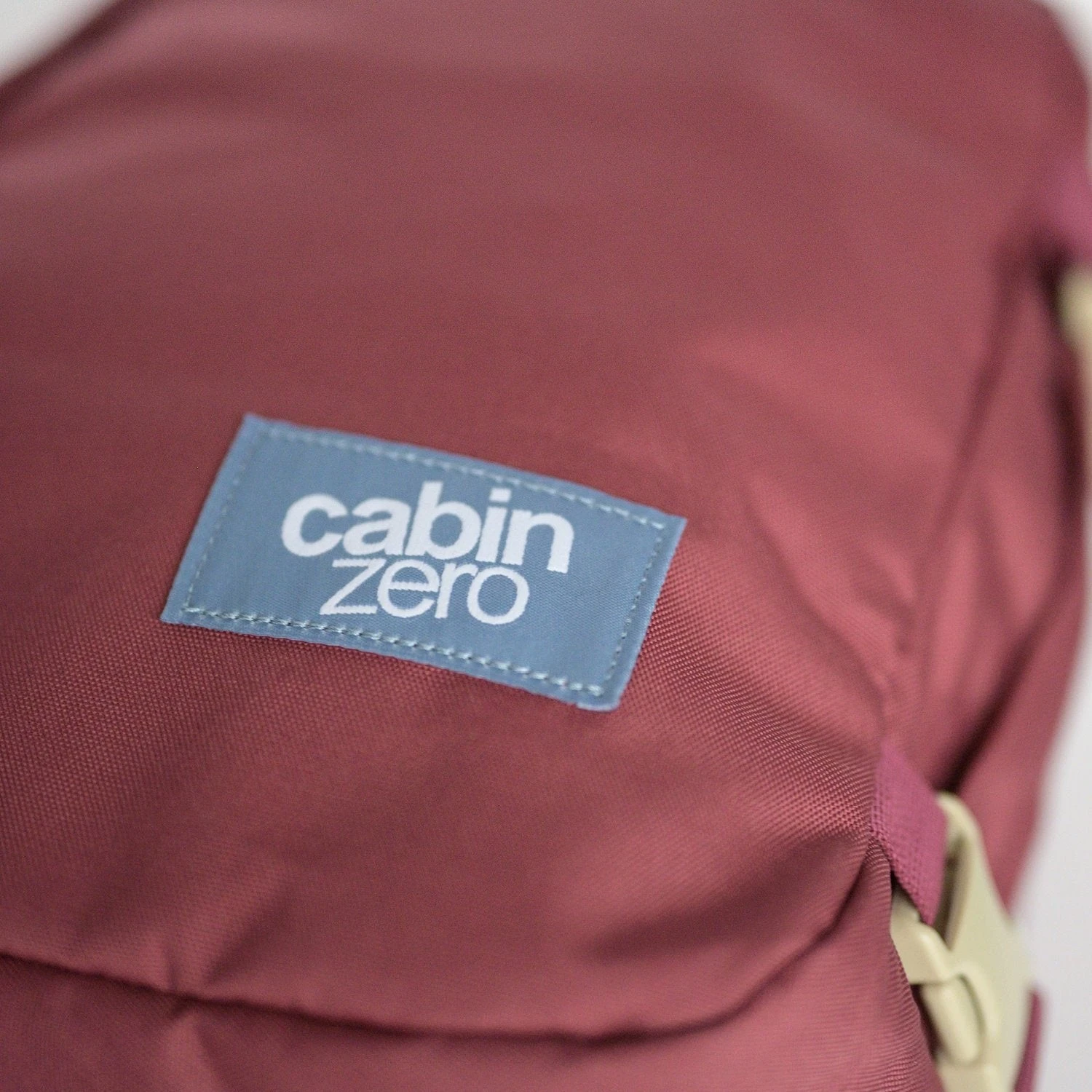 Mochila-bolsa de viaje de la marca Cabin Zero, robusta , ligera y funcional. Tiras para llevar a la espalda acolchadas . Tambien dispone de asa superior y asa lateral para poder llevarlo de mano. En el interior compartimento acolchado para poder llevar el portatil y bolsillos con cremallera. Recubrimiento resistente la agua. Perfecto para llevar en el avion debajo del asiento. Medidas 39 x 29,5 x 20 , con capacidad de 28 Ltrs. Color Granate.