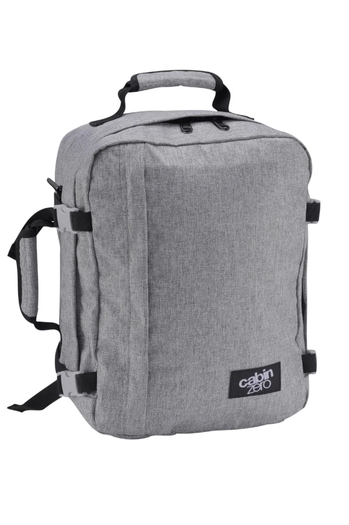 Mochila-bolsa de viaje de la marca Cabin Zero, robusta , ligera y funcional. Tiras para llevar a la espalda acolchadas . Tambien dispone de asa superior y asa lateral para poder llevarlo de mano. En el interior compartimento acolchado para poder llevar el portatil y bolsillos con cremallera. Recubrimiento resistente la agua. Perfecto para llevar en el avion debajo del asiento. Medidas 39 x 29,5 x 20 , con capacidad de 28 Ltrs. Color Gris claro.
