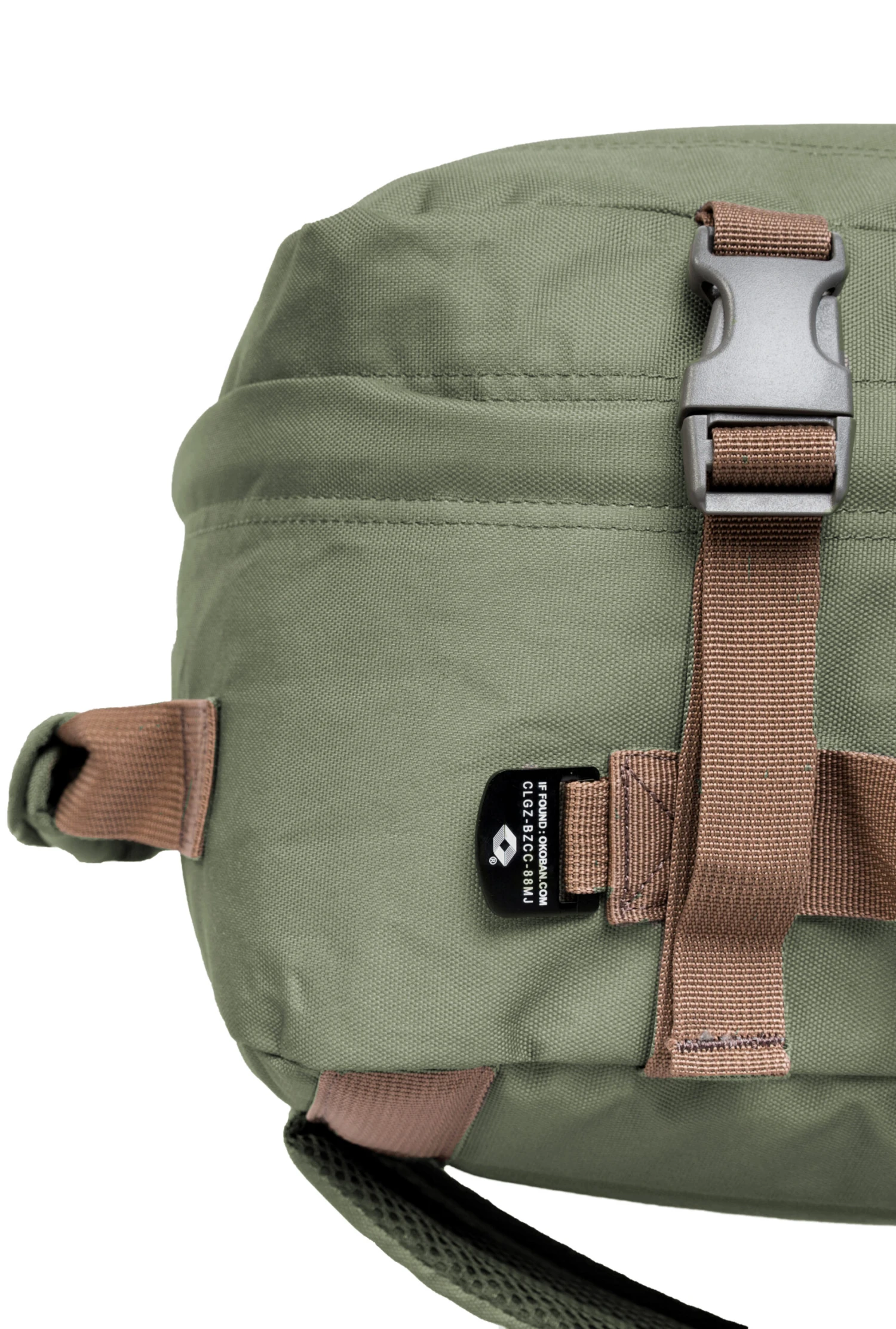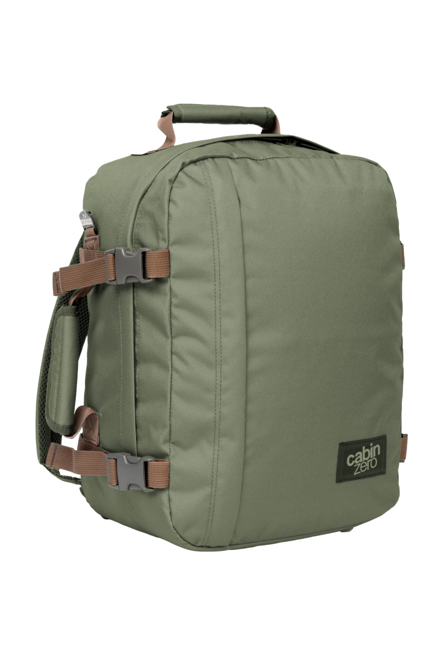 Mochila-bolsa de viaje de la marca Cabin Zero, robusta , ligera y funcional. Tiras para llevar a la espalda acolchadas . Tambien dispone de asa superior y asa lateral para poder llevarlo de mano. En el interior compartimento acolchado para poder llevar el portatil y bolsillos con cremallera. Recubrimiento resistente la agua. Perfecto para llevar en el avion debajo del asiento. Medidas 39 x 29,5 x 20 , con capacidad de 28 Ltrs. Color Kaki, con cintas marrones.