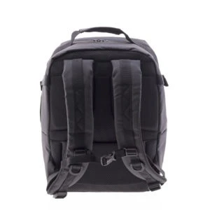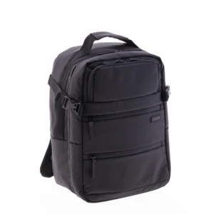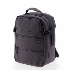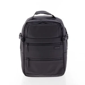 Mochila de viaje en color negro en tamaño pequeño especialmente útil para volar con Vueling con sus medidas adecuadas como equipaje de mano, resistente al agua y fabricada en polyester. En el exterior tiene asas en la parte superior y en el lateral. En el interior tiene un compartimento para ordenadores portátiles de 14 pulgadas con organizador