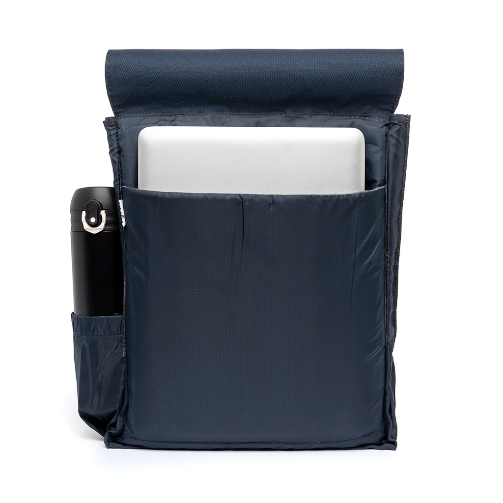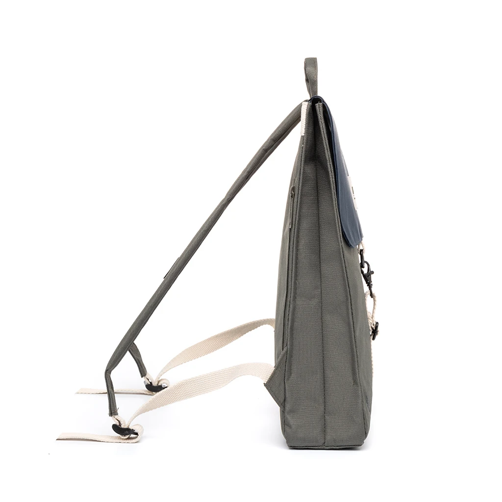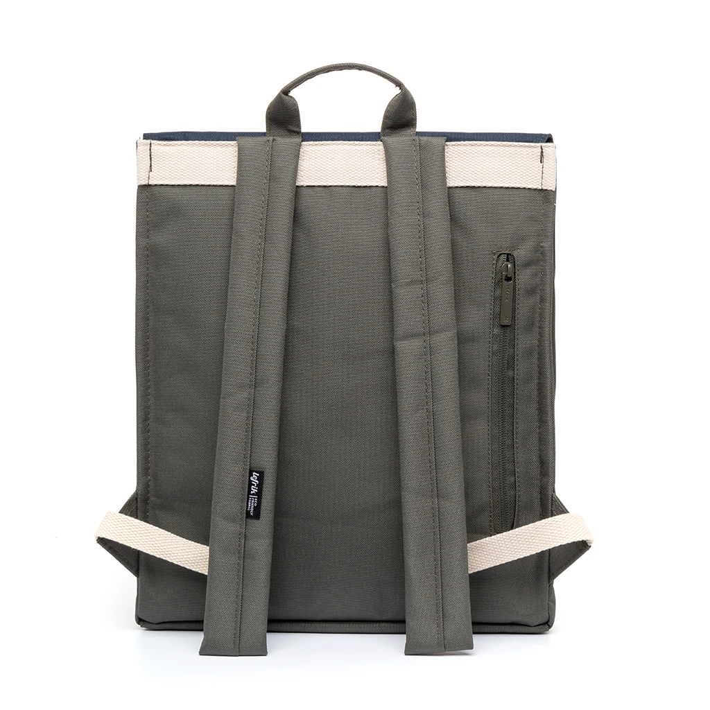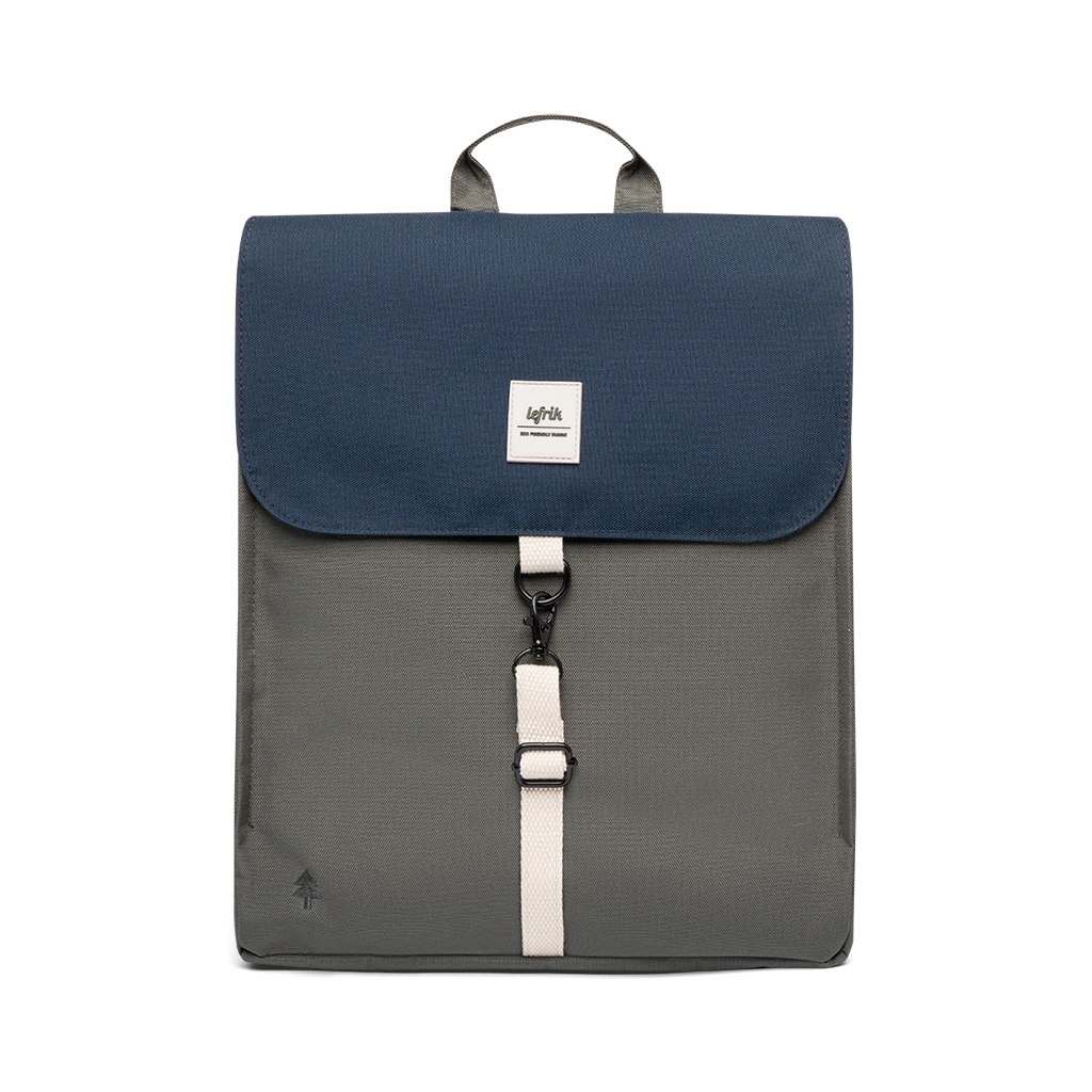 Mochila de la marca Lefrik, en tamaño más pequeño que el modelo Handy. Sus medidas son 35 x 30 x 9. Mochila plana con capacidad para un ordenador de 13,6″ . Dispone de bolsillo interior con cremallera y bolsillo trasero de seguridad. Confeccionada en poliester reciclado resistente al agua. Color Azul combinado con kaki.