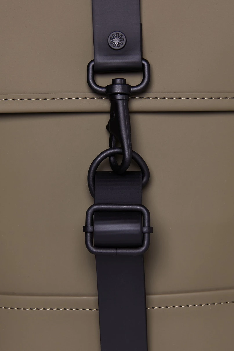 Mochila de la marca RAINS, tamaño mini.Compartimento principal único, y bolsillo trasero de seguridad. Bolsillo interno con cremallera. Correas de la espalda engomadas y regulables . Solapa superior con cierres a presion magneticos , y luego con el caracteristico mosqueton . Su confección con poliuretano la hace toatlmente impermeable. Capacidad para ordenador de 13″ con funda , o de 15″ sin funda.Color marrón claro.