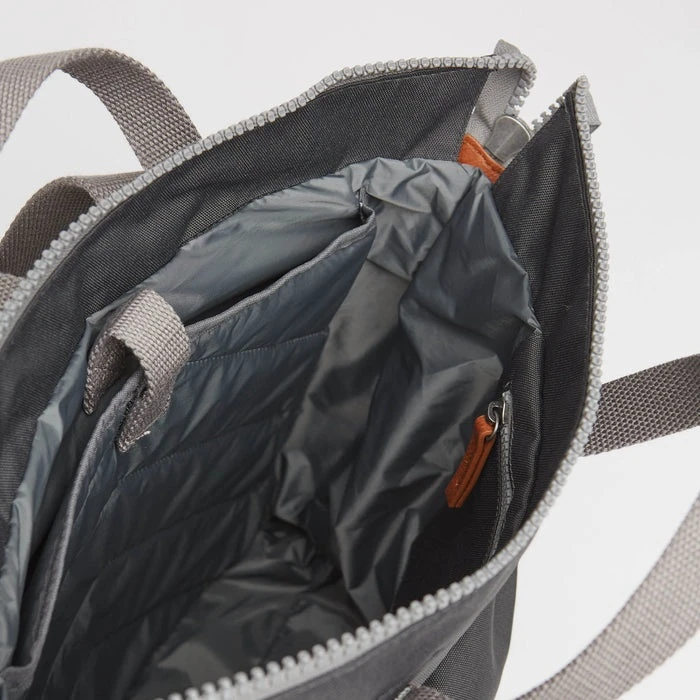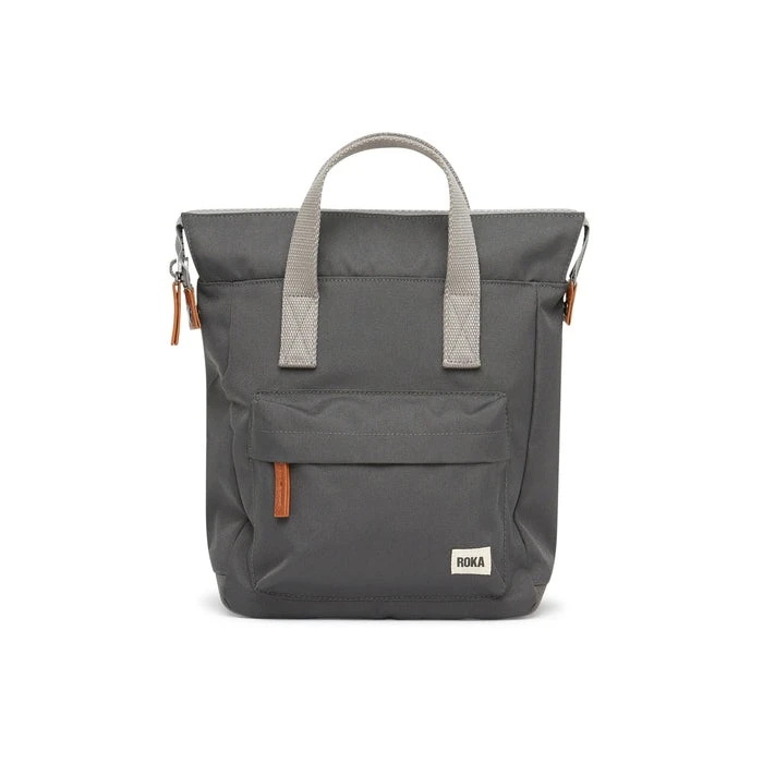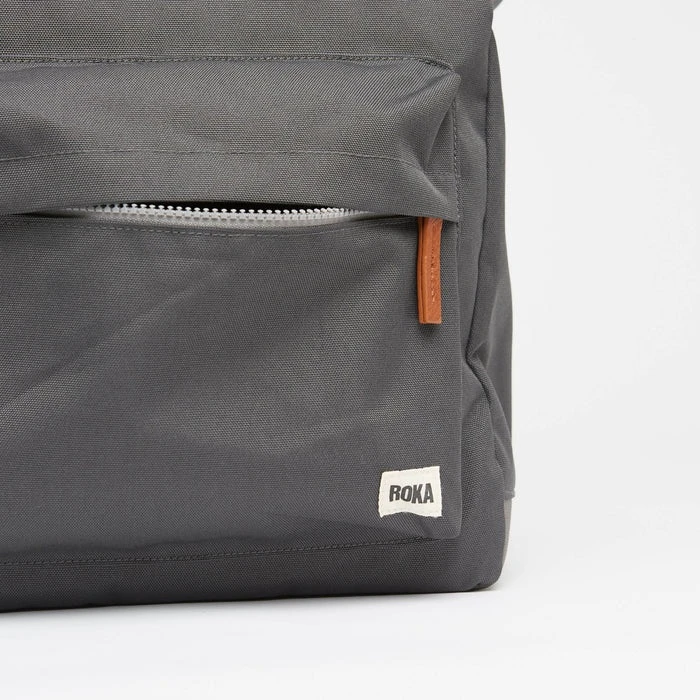 Mochila de la marca Roka London, modelo Bantry B. Tamaño pequeño con medidas 32 cm x 23 x 10 cm. y capacidad de 7,35 ltr. Confeccionado con materiales reciclados (PET), y aptas para veganos. Su material es repelente al agua. Lleva un bolsillo exterior central cerrado con cremallera. En el interior lleva compartimento acolchado para tablet. Cierra con cremallera en la parte superior. las tiras de la espalda son de algodon para mas comodidad. Color Gris.