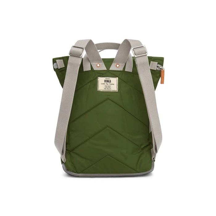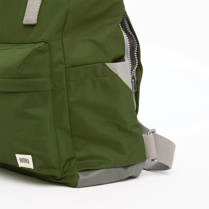 Mochila de ciudad modelo Canfield B de la marca Roka London de tamaño pequeño en color verde aguacate con cierre de cremallera y de nylon más lona resistente. La mochila tiene un compartimento interior para ordenador además de otros dos bolsillos de cremallera. En el exterior hay un bolsillo de cremallera. Las correas son de algodón para una mayor comodidad.