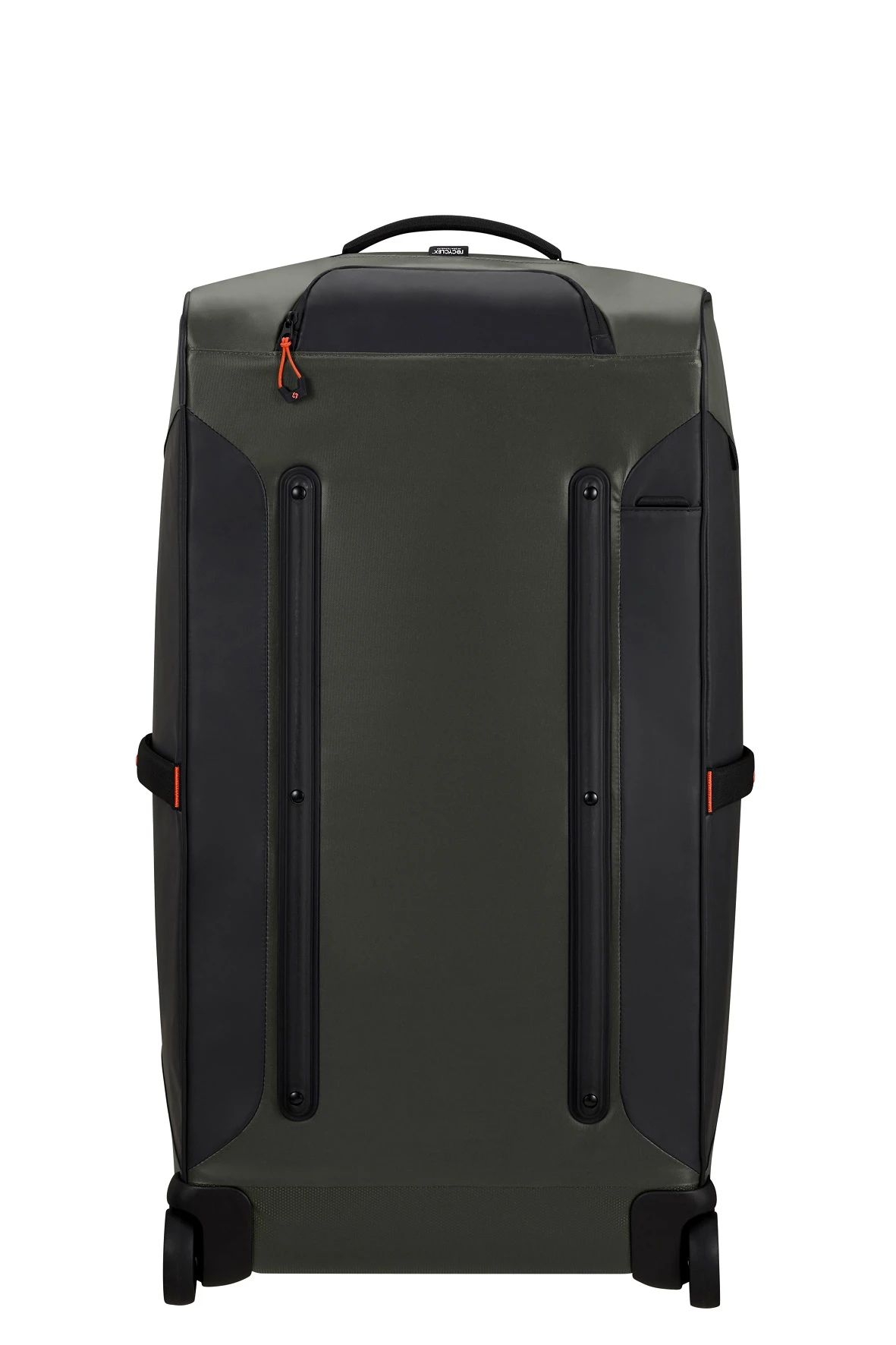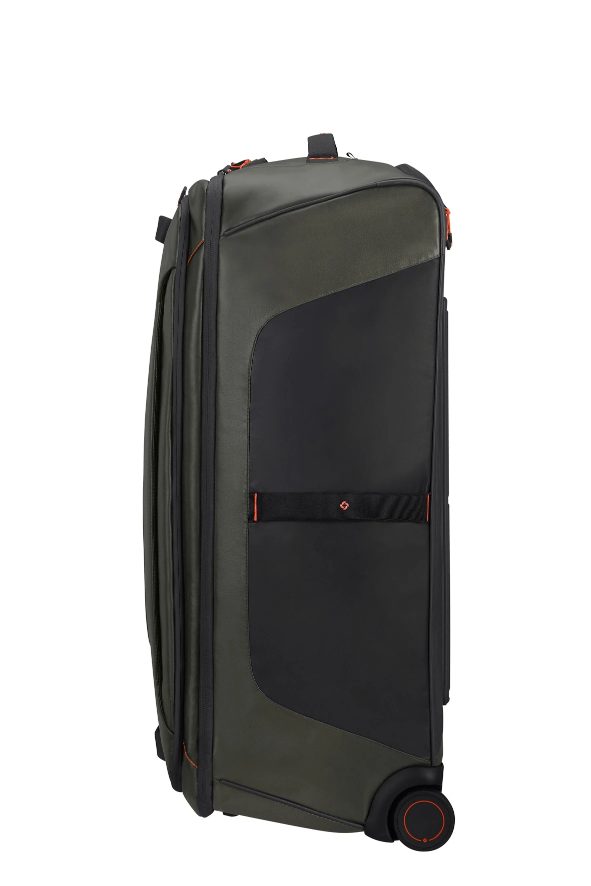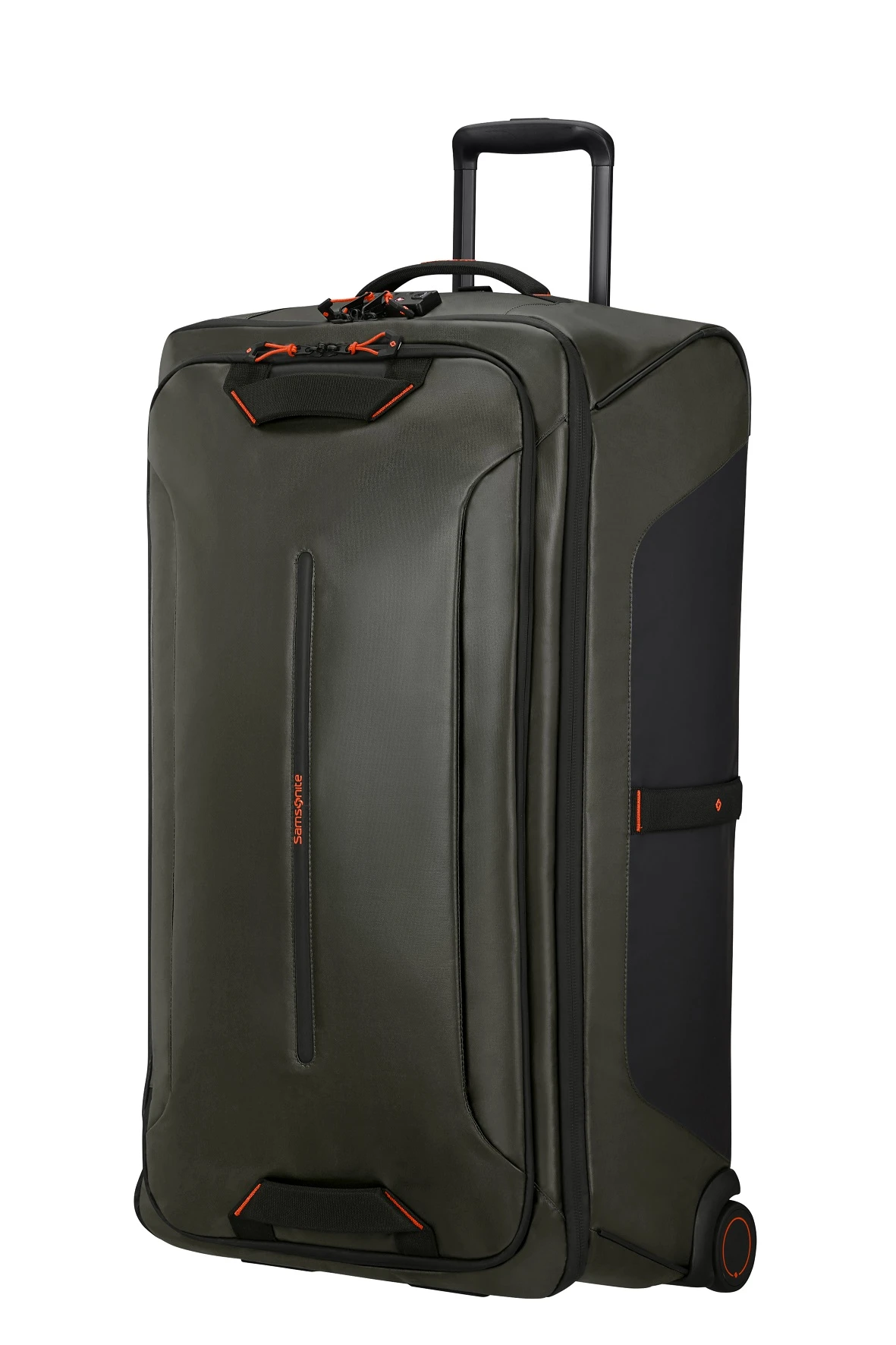 Trolley-bolsa de viaje en tamaño grande de 79 cm y 2 ruedas de la marca Samsonite modelo Ecodiver en color verde kaki. De gran capacidad , 122 ltrs, te permite usarla en tus viajes mas largos. Confeccionado en material PET reciclado totalmente impermeable.